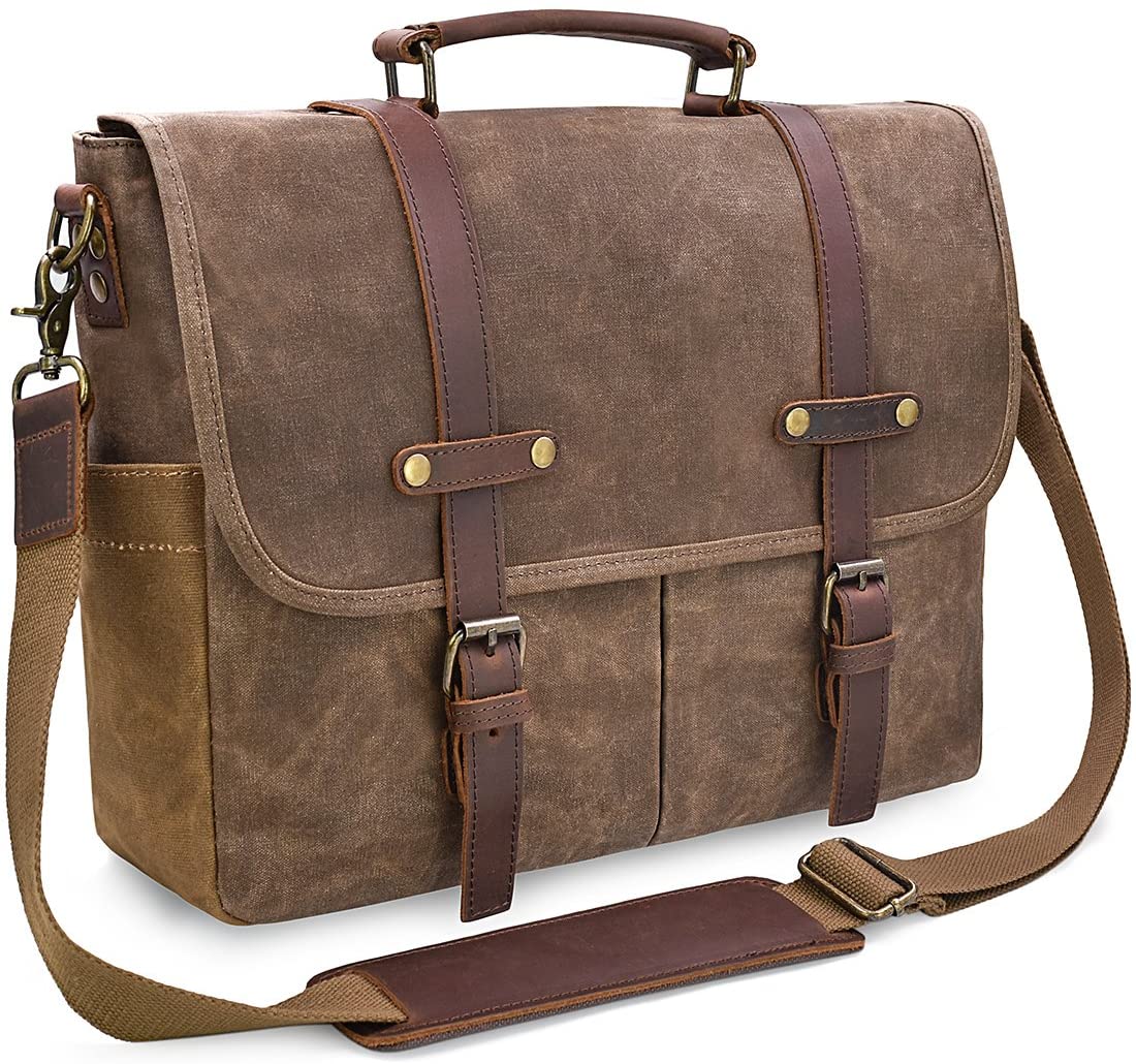 Mens Messenger Bag 15.6 Inch Waterproof Vintage Genuine Leather Waxed Canvas Briefcase Large Satchel Shoulder Bag Rugged Leather Computer Laptop Bag, Brown